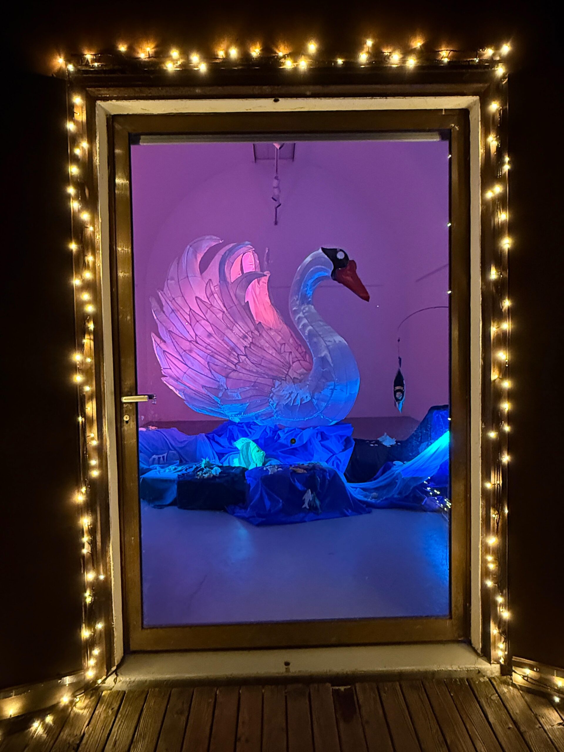 Folgen Sie der schwebenden Feder und werfen Sie bei Ihrem Abendspaziergang einen Blick hinein, entdecken Sie das leuchtende Geheimnis im Winterdunkel.